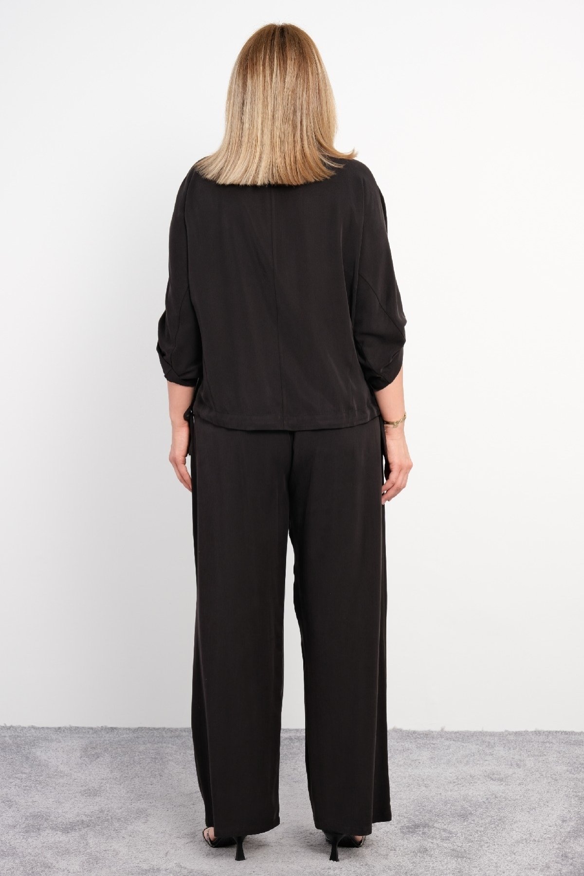 كبيرة الحجم المرأة السوداء ، قصيرة الأكمام قطعتين دعوى مع أزرار أكمام ، أعلى زر الأزهار الربط ، قميص طوق.