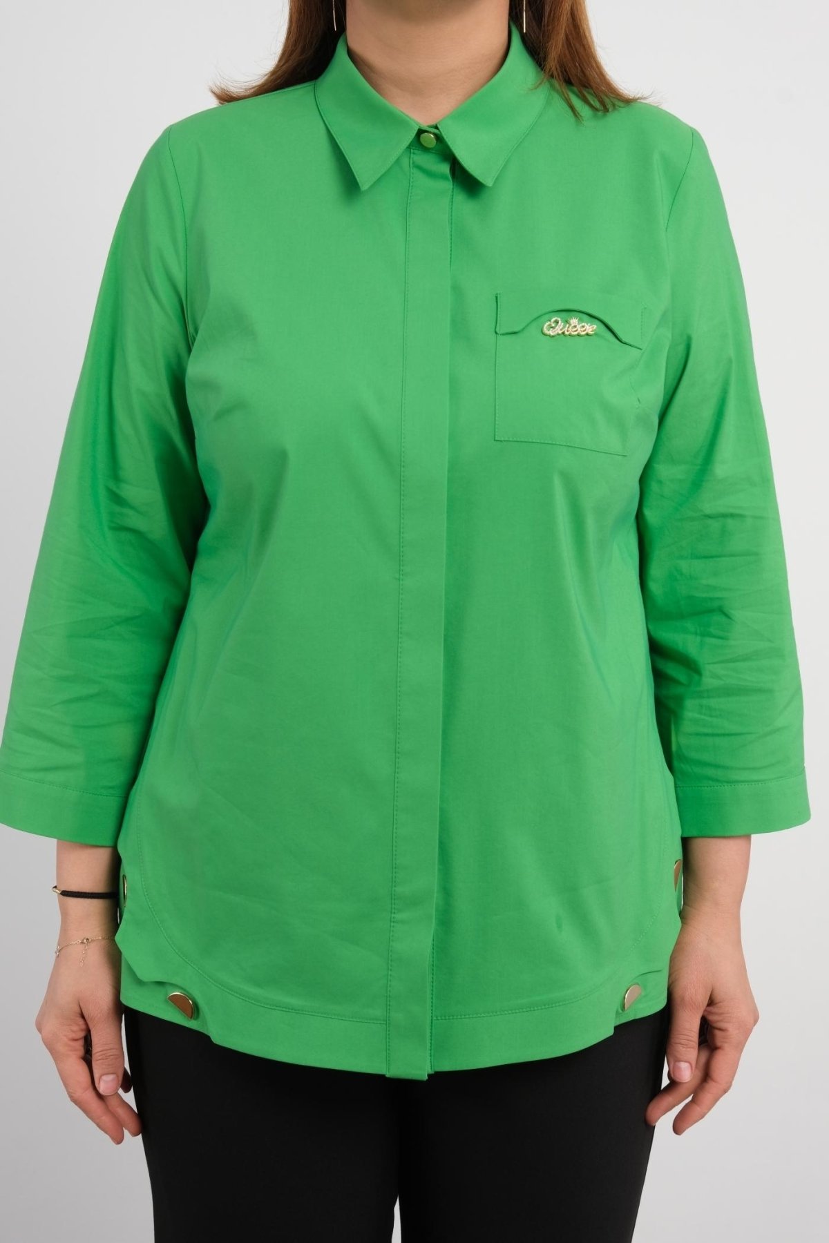 تتميز هذه القميص النسائية ذات الحجم الكبير بلونها الأخضر الزاهي. مصنوعة من مزيج من الأقمشة بنسبة 65٪ قطن و30٪ بوليستر و5٪ إلاستان، مما يجعلها مريحة ومرنة. ترتدي العارضة مقاس 44، ويتوفر هذا القميص بمقاسات 44، 46، 48 و50. يتميز القميص بياقة كلاسيكية وإغلاق أمامي بأزرار. الأكمام الطويلة مزودة بأزرار على الأصفاد. كما أن هناك شعار العلامة التجارية على الصدر. ينتهي الجزء الخلفي من القميص قليلاً فوق الركبة، مما يوفر مظهراً عصرياً وأنيقاً.