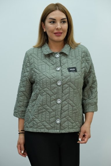 This product is a STELLA brand plus-size women's jacket, available in khaki. The jacket is offered in four different sizes: 42, 44, 46, and 48. The fabric composition is 80% cotton, 15% elastane, and 5% Lycra. It features five front buttons and a collar detail that makes it both easy to wear and stylish. The jacket catches the eye with its quilted patterns and has 3/4 sleeve length. It offers a combination of casual elegance and comfort.