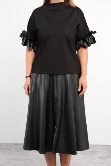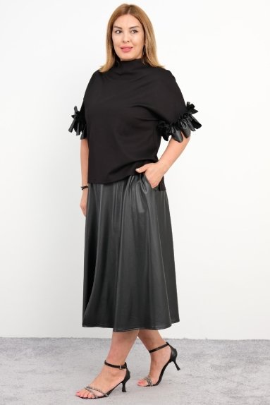 This product is a plus-size women's STELLA outfit in black color. Available sizes include 42, 44, 46, and 48. The fabric content is 65% cotton, 30% polyester, and 5% elastane. The top part of the outfit features lively ruffles on the shoulders and sleeves, adding a dynamic touch. The bottom part is a stylish skirt with a shiny appearance. The high-quality fabric offers comfort and flexibility. This design is an excellent choice for both everyday wear and special occasions.