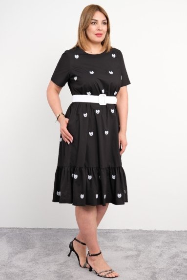 This product is a stylish dress from the STELLA brand, designed for plus-size women. The black dress features white printed cat figures scattered throughout, adding a playful touch. With its short sleeves and round neckline, this dress prioritizes comfort, while the white belt detail accentuates the waist. Its midi length makes it suitable for both everyday wear and special occasions. The dress is available in sizes 50, 52, 54, and 56. The fabric composition is a blend of 65% cotton, 30% polyester, and 5% elastane, making it both soft and stretchy.