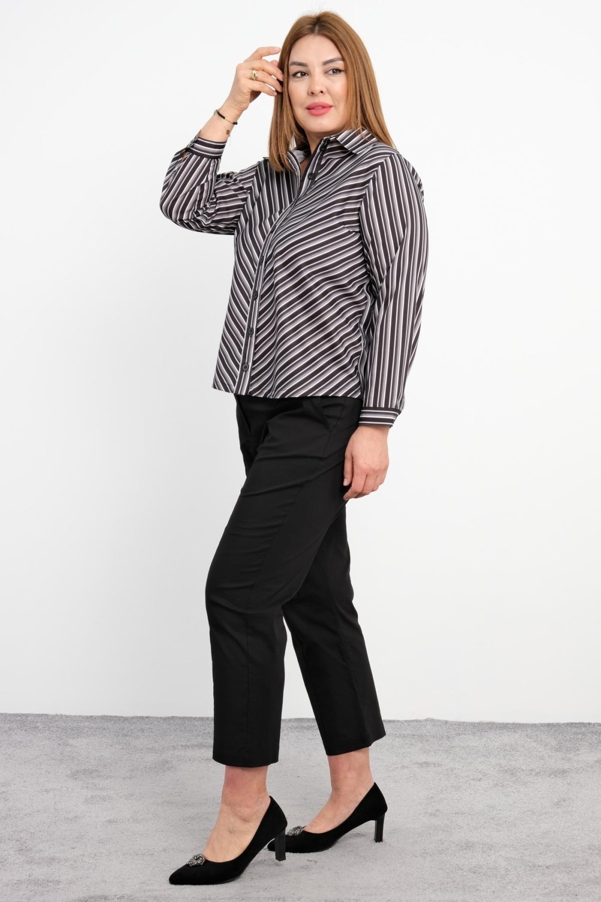 This plus-size womens classic twin set combines elegance and comfort. The product is black and available in sizes 42, 44, 46, and 48. The top features a striped pattern with button details on the front. The bottom part consists of plain black pants. The fabric content is 80% cotton and 20% polyester, ensuring comfortable wear all day long.