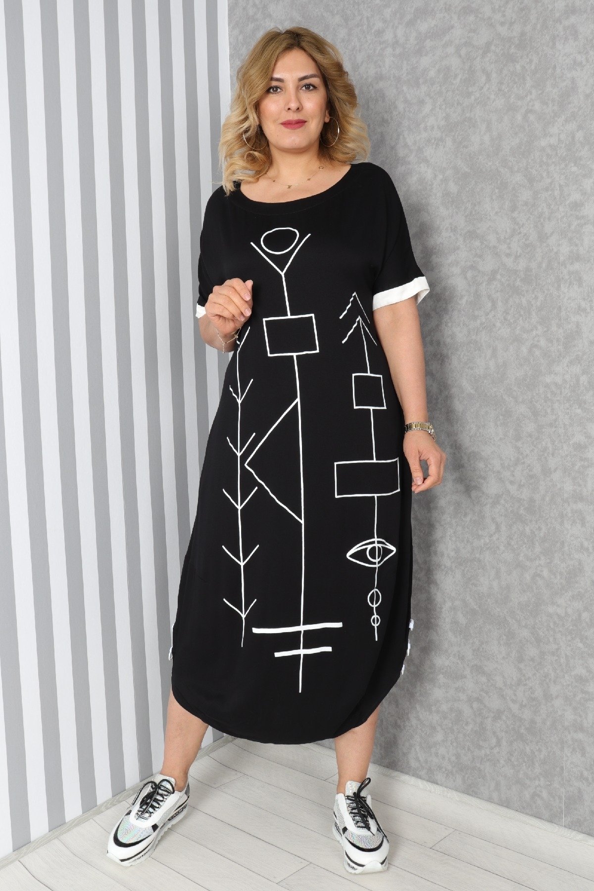 yuvarlak yaka, kısa kollu, geometrik baskılı, etek ucu oval, yazlık şık büyük beden elbise