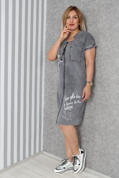 büyük beden şık, fermuarlı, cepli yazı baskılı, kot elbise