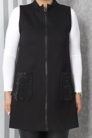büyük beden hakim yaka cepleri payet işlemeli fermuarlı şık bayan yelek