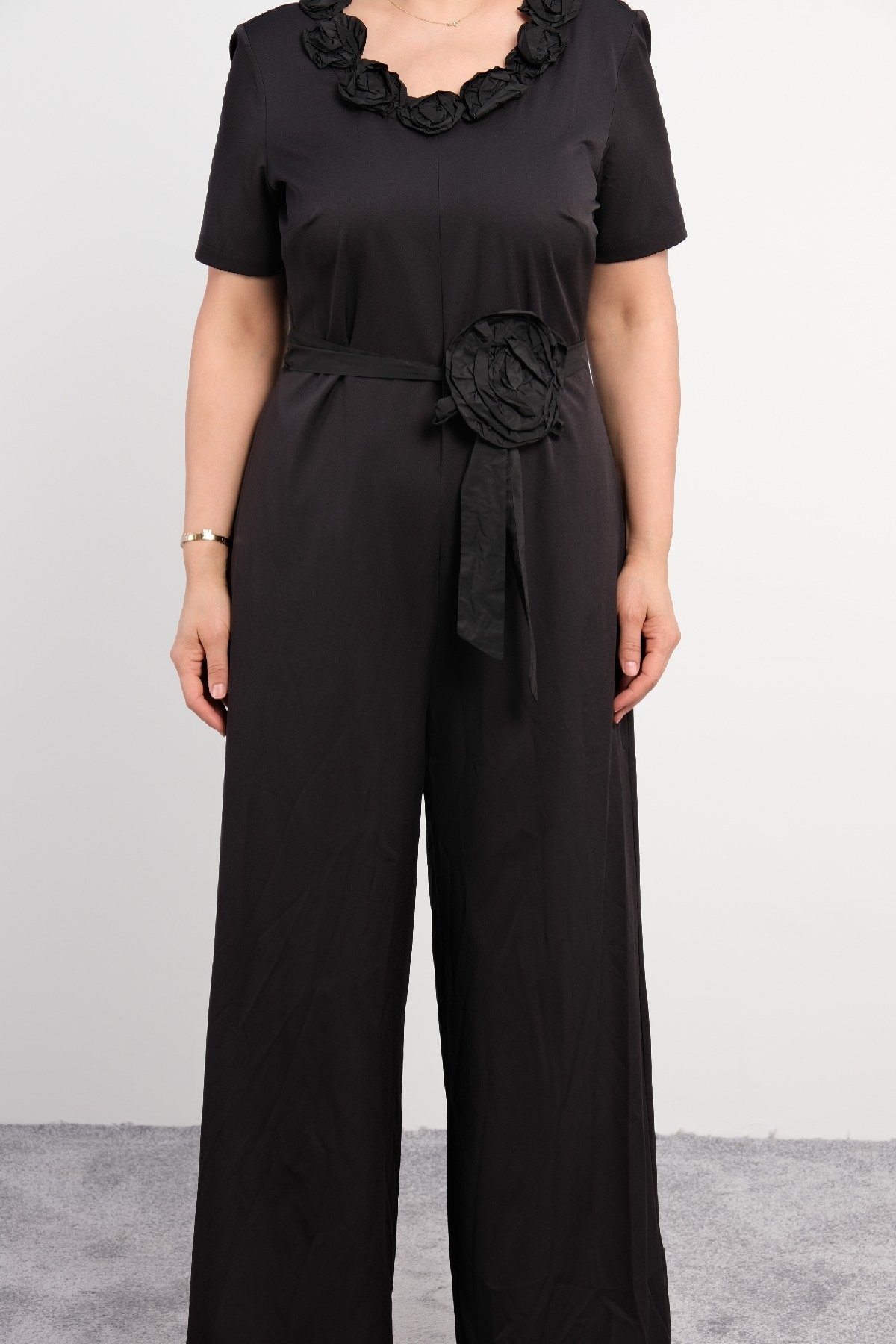 Büyük beden kadın siyah, yuvarlak çiçekli yaka, bel çiçek detaylı kemer, kısa kollu tulum.