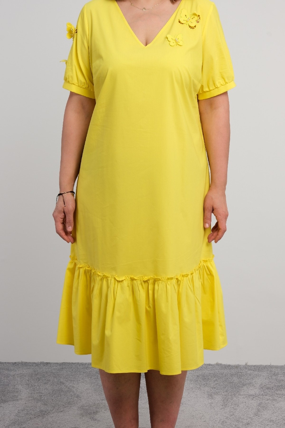 Büyük beden kadınlar için önünde kelebek detayları olan, alt kısmı büzgülü, kısa kolu, sarı renk uzun elbise.