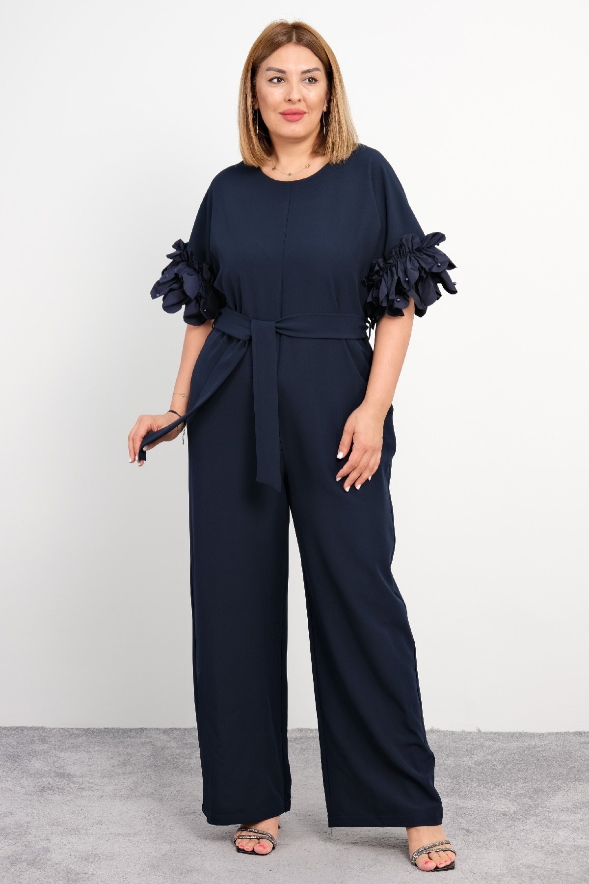 Bu büyük beden kadın tulum, şık ve modern tasarımıyla dikkat çekiyor. Lacivert renkli olan bu tulum, yüzde 50 pamuk, yüzde 42 polyester ve yüzde 8 likra içeriğiyle oldukça rahat ve esnektir. Ürünün beden seçenekleri 42, 44, 46 ve 48 olarak sunulmaktadır. Özel olarak tasarlanan kollarıyla fark yaratan bu tulum, bel kısmındaki kuşak detayıyla da şıklığına şıklık katıyor. Hem günlük kullanım hem de özel davetler için ideal bir tercih olabilir.