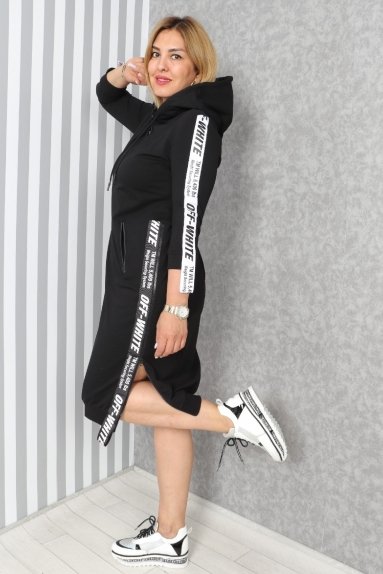 çizgili kapşonlu fermuarlı cepli spor tarz elbise